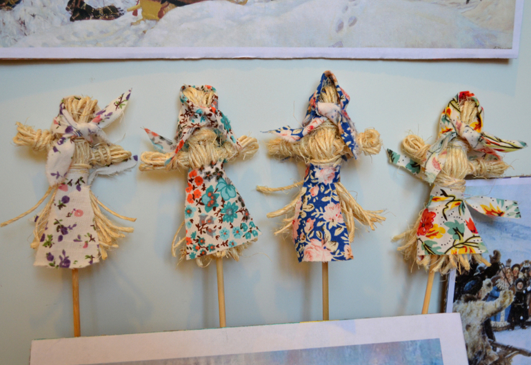 * чучела Масленицы. Сделала сама из веревки и маленьких кусочков ткани, насадила на деревянную шпажку для шашлыка.
