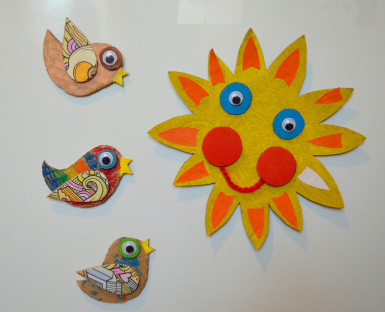 Дима сейчас любит клеить, а мой вклад - подготовка деталей, поскольку ножницами малыш пока не очень-то заинтересовался. Знакомясь с Масленицей, мы для начала сделали Солнышко и всю неделю просили у него тепла. А помогали нам птички, которых мы всей семьей расскрасили масляной пастелью и собрали из деталей. Интересно, что они получились абсолютно разные!