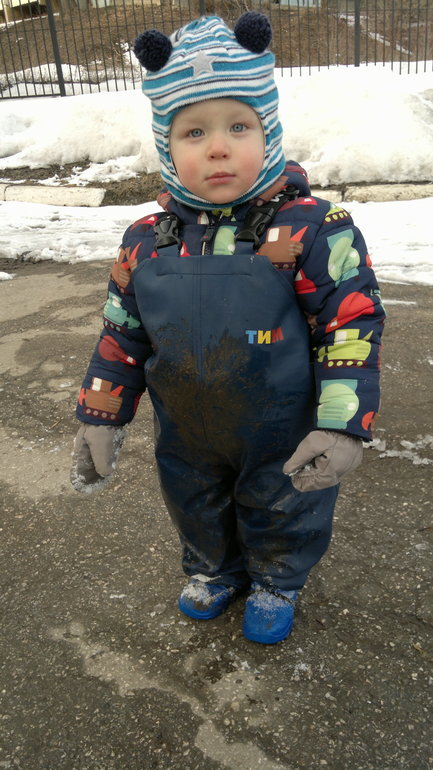 Вот и вчера в самом начале прогулки сын как водится поплескался в лужах, поползал в остатках снежной горки (теперь это снежно-земляная горка) и был очень брутален и горд собой.