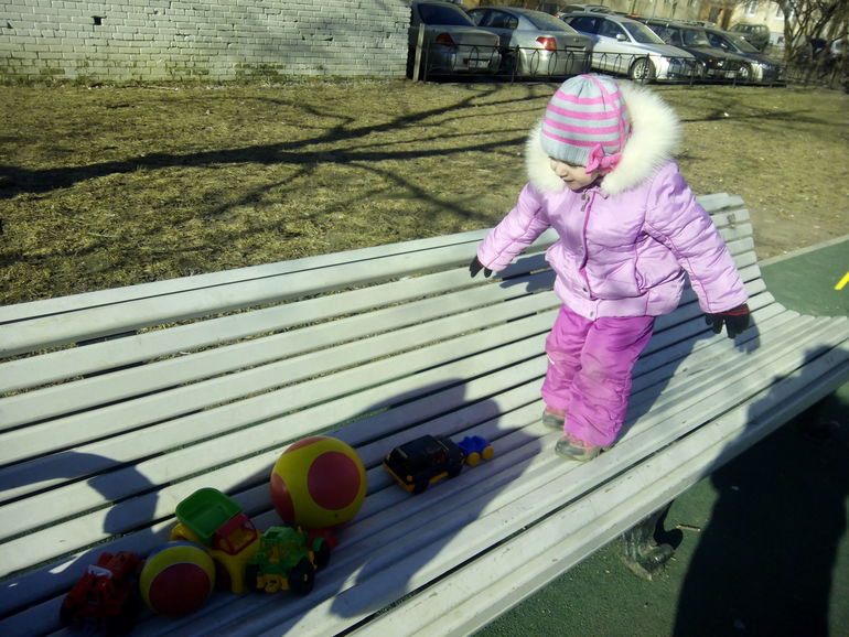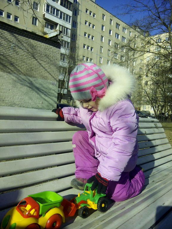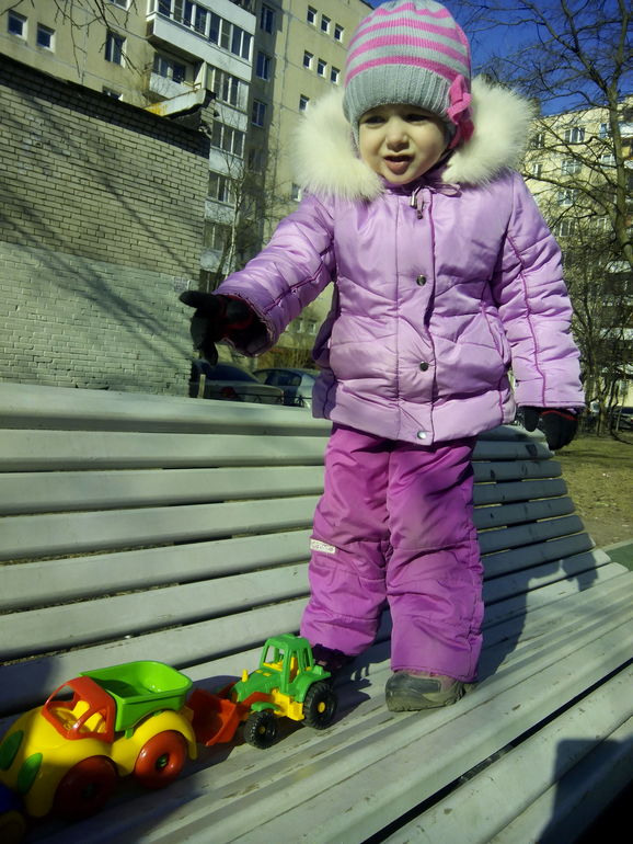 Так же проснулась любовь к машинкам, у нас их немного, надо исправляться, все таки сынок растет - но на площадке у нас все выкладывают свои игрушки и детки по очереди играют...ага!! Кристи собрала все машинки на скамейке и играла - крича мое! В итоге под шумок, уходя домой, утащила одну машинку...так стыдно...надо вернуть...благо помню чья!