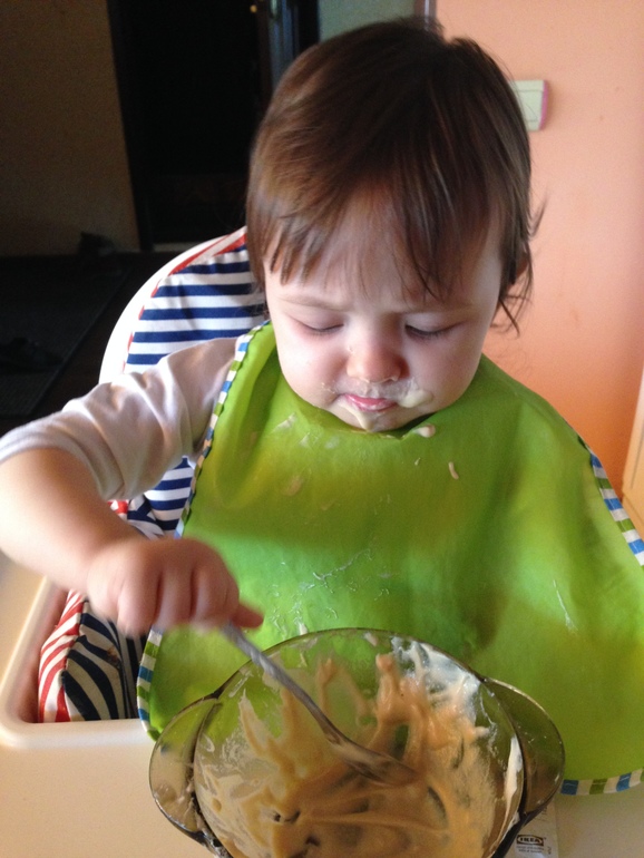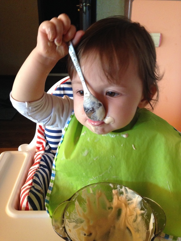 Сейчас активно занялась обучением ее практическим навыкам,самообслуживанию. Даю ей есть самой,тут моё сердце обливается кровью,при виде стекающей по стенам каши,или мясного пюре,втертого в волосы и тп,но смирно сижу,не лезу, хотя пока только одно кормление отдаю на самопоедание,остальные отдаю когда в чашке остаётся 3-5 ложек,она пытается доедать. Пока успехи сомнительные,но ложку пихает в рот и зачерпывает правильной стороной.