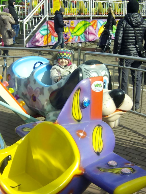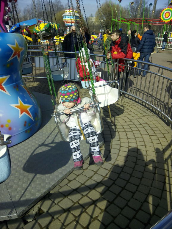Куда там! Сначала покаталась на Карусели - на белочке , я стояла рядом) Потом на качелях - цепочки, и тут она увидела самолеты! Там мы и зависли! Денег я взяла немного) Так что уходили с криками(( Нечего не помогало успокоить, не сок, не мороженое, даже мыльные пузыри...только самолеты!! и сейчас!...