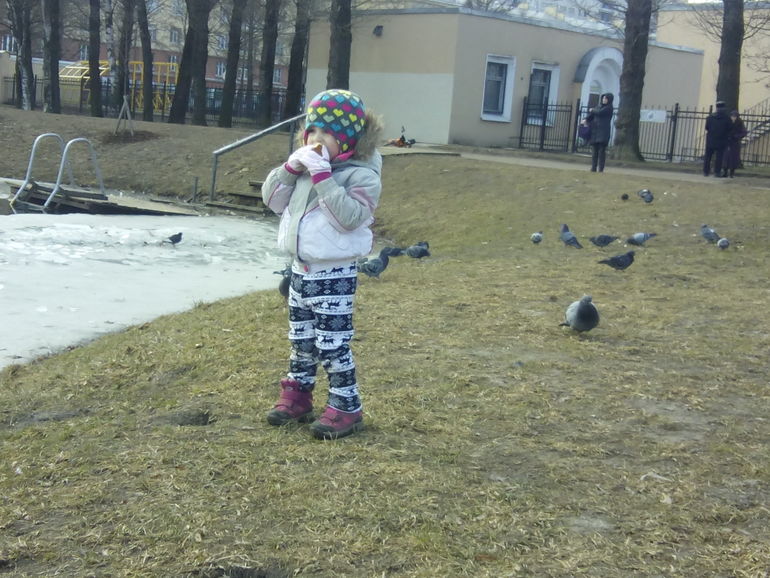 Дальше пошли кормить уточек, пруды еще не оттаяли и поэтому уточек не было(( Кормили голубей! Кристи откусывала булочку и кидала им сама)