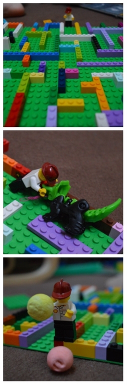 мы построили ЛАБИРИНТ из лего. Вначале просто проходили, искали выход. А потом усложнили: положили на выходе сокровище, а в лабиринт посадили голодного дракона и в одном из закоулков спрятали еду для него. Соответственно человечек должен был найти еду, потом покормить и задобрить дракона и тогда пройти за сокровищем. Круто?))) Это у меня мама уехала, приходится детьми заниматься)))
