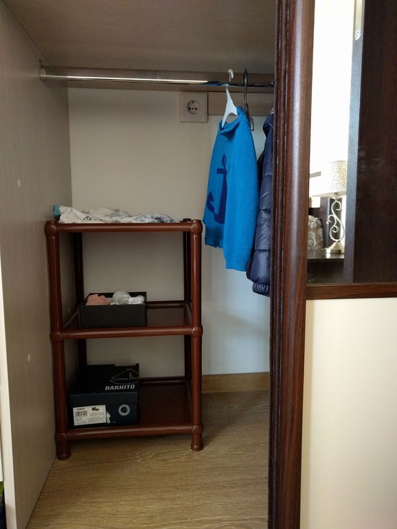 В комнате у Вани есть своя полочка, на которой лежит пижама и носки, иногда я кладу туда пару сменных футболок, а также пара вешалочек в нашем шкафу для его кофточек.
