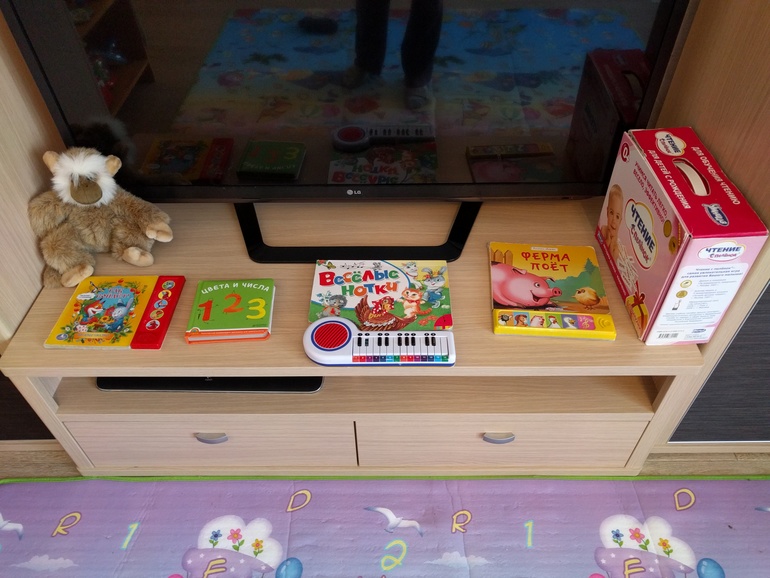Возле телека у нас импровизированная библиотека, чтоб малыш хорошо видел книги и мог выбрать сам, что ему нравится и хочется "почитать".