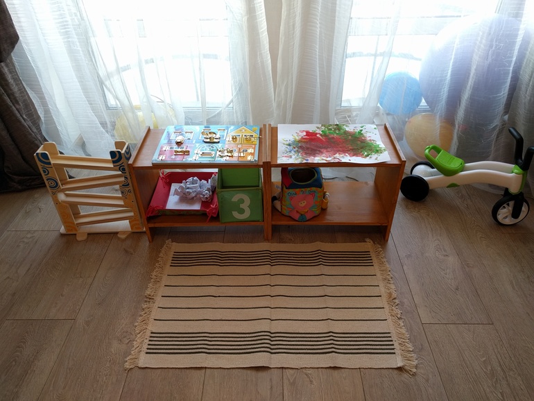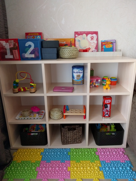 Начну со стеллажа. Все просто- муж нарисовал, мебельщики сделали. Игры и подносы стараюсь менять раз в неделю примерно. Наверху корзиночки с материалами для занятий и моими мелочами. Ну и книжки, которые легко порвать. Внизу корзинки с антивандальными книжками и игрушками, которые я периодически меняю между собой на полках.
