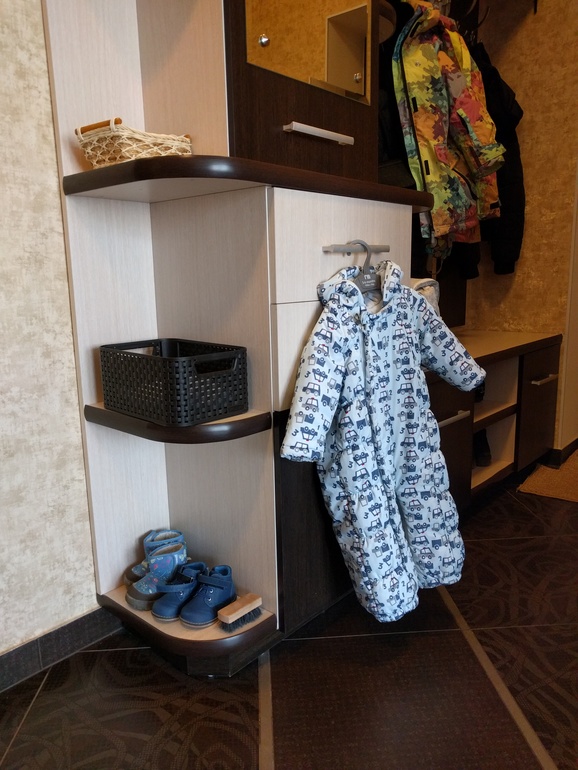 Тут для малыша у нас имеется своя вешалка, полочка для ботинок и щеточка для них же, а также ящичек для шапок и варежек. Конечно-конечно, сам он еще часто раскидывает ботинки по всему дому, и комбез на вешалку не вешает, но вот нет-нет, ла и повощит щеткой по ботинкам, почистит.