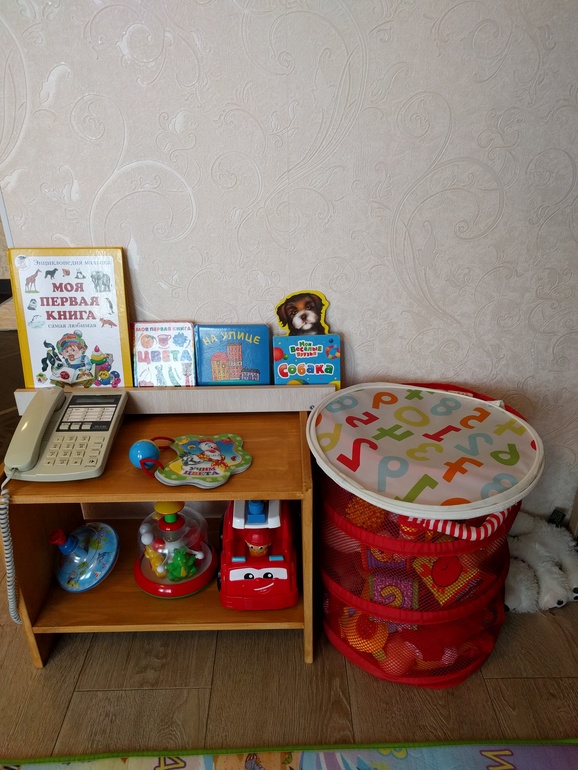 Ну и в уголочек влезла еще тумбочка и корзина для игрух. На тумбочке у нас телефон, по которому сто раз в день ведутся переговоры с бабушками и дедушками. Внизу пара игрух. И книги опять же. Кстати, уголок для чтения книжек я делаю простым движением смахивания подушек с дивана на пол.