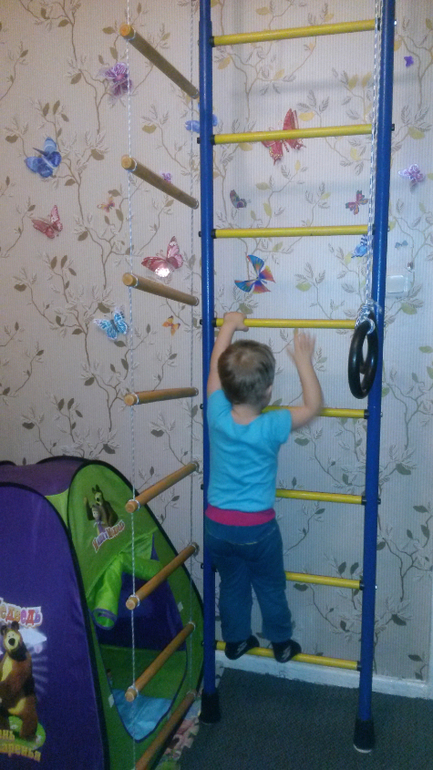 Вот и сама стенка) лесенка, турник, канатная лесенка, канат, кольца) а качельку вешаем отдельно) очень рады приобретению,а-то уже наша обезьянка везде где только можно было дома подтягивалась,висела)) теперь надеюсь,больше не будет у нас привычного вывиха(локтевой сустав)