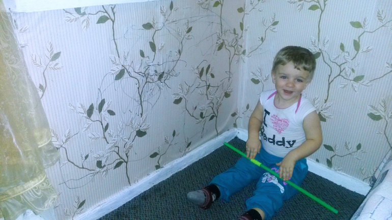 А вот наконец-то и я не уследила...появилась у нас дома настенная живопись...два дня подряд....и маркером главное,удалить без вариантов...придется переклеивать обои)) хорошо,хоть штора закрывает слегка)))) подозреваю,что виной моя роспись окон снежинками и елочками на новый год)