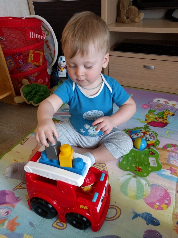 Мои руки уже накачались от закидываний ребенка на горку! Также стал сам забираться на лесенку раннего старта и интересоваться Лего.