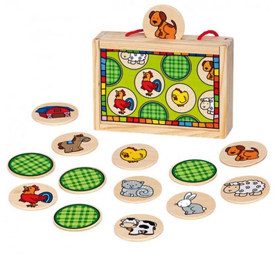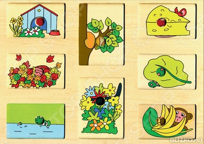 Игра на поиск пар. У нас животные. То, что из дерева - просто моя прихоть, можно и из картона что-то подобное. Пока ребенок мал, просто стараемся привлечь его внимание, что есть ДВЕ собачки, ДВЕ коровки, а вот ОДНА коровка спряталась и тд.