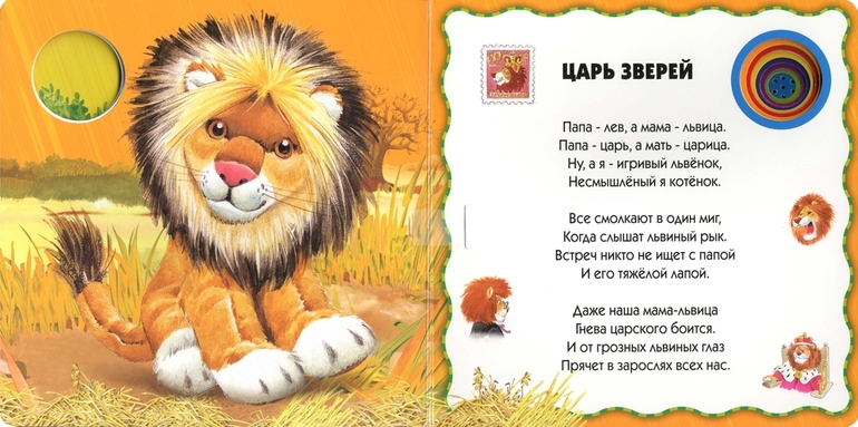 В книге большие иллюстрации животных, стих про каждого и восемь животных озвучены. Просто и интересно. Я еще к каждому нарисованному животному подобрала карточку с его "живым" изображением и даю дочке сравнивать.