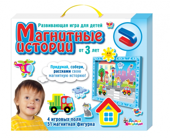 Прекрасным примером магнитных игр считаю Магнитные Истории. Пока мы просто учим слова по магнитикам, я разыгрываю какие-то сценки для ребенка. Ну и она туда-сюда их прикладывает и снимает=)