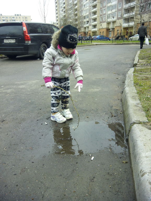 Пап наш уехал на дачу, а мы гуляли сегодня по дорожкам! Пускали мыльные пузыри, кормили голубей - Мишке так понравилось на это смотреть, смеялся во всю!! Потом спасли большого червяка Макса - переложили его с дороги, где паркуются машины в травку! Дальше, Кристи увидела лужу, там маленький червячок - пыталась его палочкой вытащить, потом в итоге начала уже баловаться и говорить, что рыбку ловит! На улице тепло, но вот под дождик небольшой попали((( и когда второй дождик начал капать пошли домой. Все равно 2 часа погуляли! Красота!!!