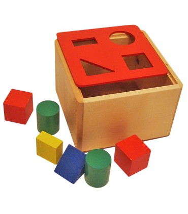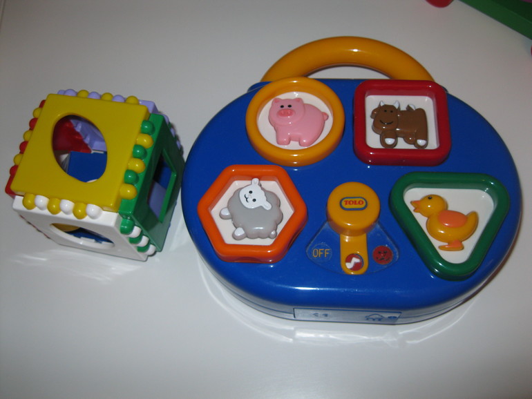 Есть такой кубик из Фикс прайса (но там фигуры такого же цвета, что и нужные грани для них, поэтому ребёнок ориентируется не столько на форму, сколько на цвет) и музыкальный сортер (подсказки - звуки животных)