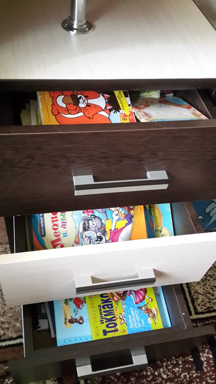 Литература, музыка и песни для детейУ все книги лежат в выдвижных ящиках, в легкой доступности. Но все равно ребенку неудобно их доставать, а особенно искать желаемую книгу.