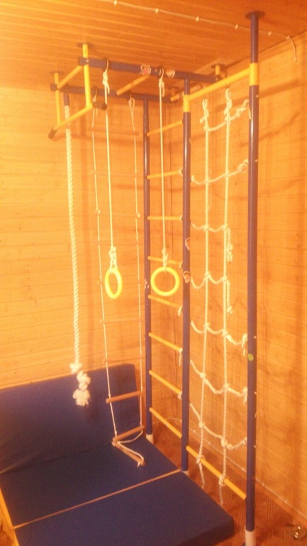 Купили на дачу - в комнату - игровой комлекс - лазалка+канат+кольца+турник+качели) Муж уже сьездил - установил, пол дня - с матами
