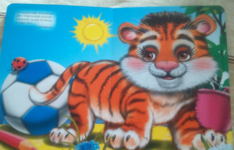 Литература, музыка и песни для детейВсем привет) Скажите, у ваших деток есть любимые, особенные книги? У нас вот так получилось, что дочка из нашей большой коллекции книг полюбила две книги. Вот эту книгу, она выделила еще в годик, когда я ее открываю, она начинает целовать каждого животного! В ней на каждом развороте по одному животному крупным планом, вот, например, тигренок: