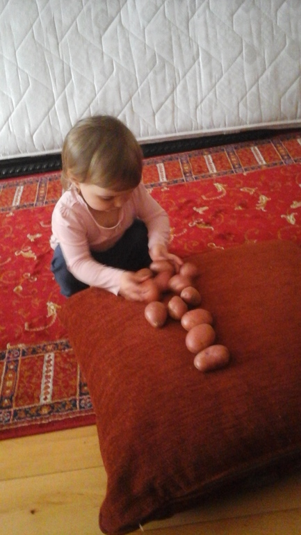 ахаха))) чем бы ребенок не тешился)))моя тоже порывается к картошке...но я не даю ))) боюсь что заиграется..я отвлекусь...и доча будет с набитым ртом сырой картошки)))))