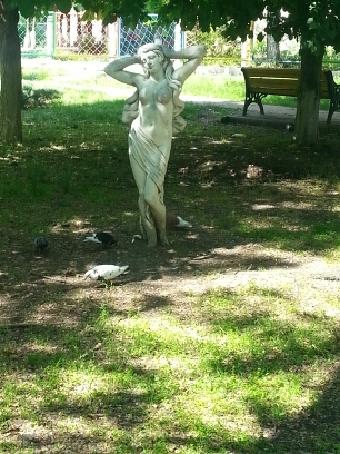 Кстати, этот парк днем - любимое место детей всех возрастов, на входе есть простенькая детская площадка. Парк перед детсадом расположен. А в самом парке есть такие статуи: