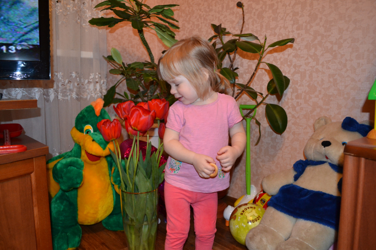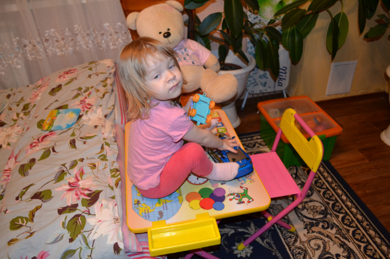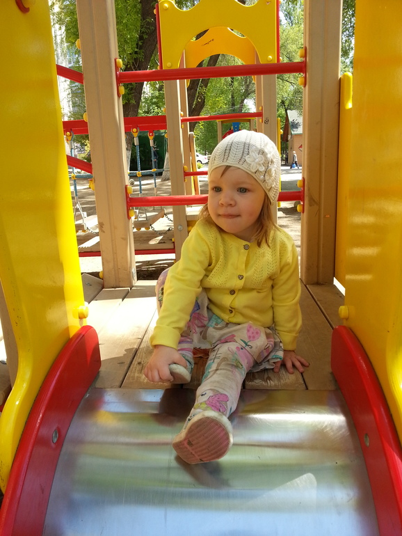 Из новых умений: считает до 10, с пропуском цифр иногда, но знает уже все, любимый отрезок "сем, осем, девять, ДЕСЯТЬ!!!". Знает основные цвета и розовый) Говорит всё подряд, слова уже чёткие, предложений разных всё больше и больше, но пока не сильно длинные. Нравится фраза: "Пека котик", это про нашего кота Персика) Постоянно сравнивает всё, машинка большая, а эта маленькая. Любит залазить по мне ногами, когда я её за руки держу, и говорит "Даша высоко".