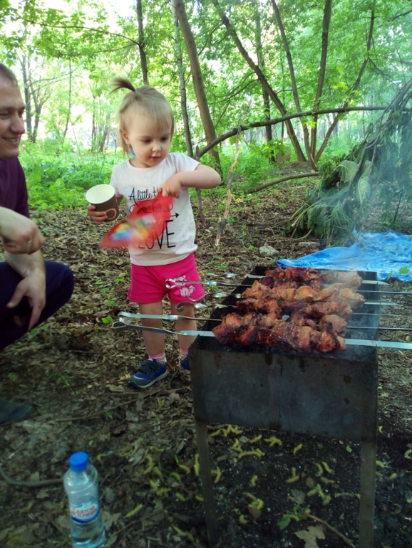 А 9 мая мая поехали к куме на шашлык,пригласила на пруды,а там начали почему-то гонять хотя вроде есть места. Пришлось искать, где делать,в итоге неплохо потусили в каком-то недоделанном парке возле новостроек,куда съехался весь народ.У Ани от переизбыдка солнца сгорело лицо,хотя была в тени все время.