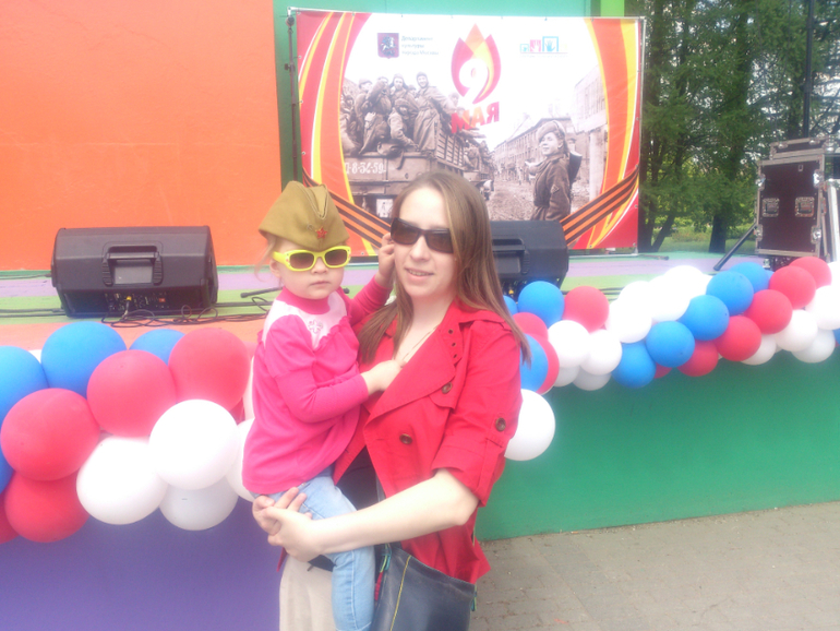 На 9 мая ходили в парк 50-ти летия Октября. Первый раз поехали на автобусе, сколько у Кати было эмоций, хлопала в ладоши, когда автобус поехал. А мама, т.е. я, лопух, сто лет в автобусе не ездила и забыла, что ребенка нужно держать. Свою попу уместила на сиденье и стала кошелек убирать, думала быстро уберу и дочку на колени посажу, а автобус поехал, зараза такая. Подождать не мог))) Конечно, я среагировала и дочку поймала, она даже не поняла, что мама лопух. Погуляли в парке, поели мороженного, половили рыбок. На батуте не прыгали, маловата еще, но дочка просила (очереди огромные). Поздравляли наших ветеранов!