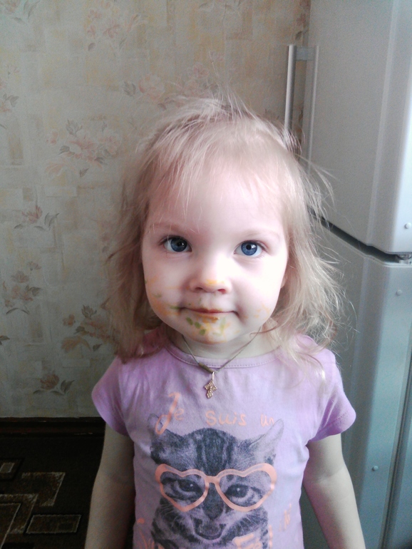 Любит помогать мне по дому и в готовке, особенно потырить нарезанные овощи. Даже капусту кусала от целого кочана. Я не препятствую, только если моркови уже на блюдо не хватает и надо снова чистить, а мне же лень))) А так, пусть грызет))). Вот моя помощница, в ночнушке, девочка-девочка здесь: