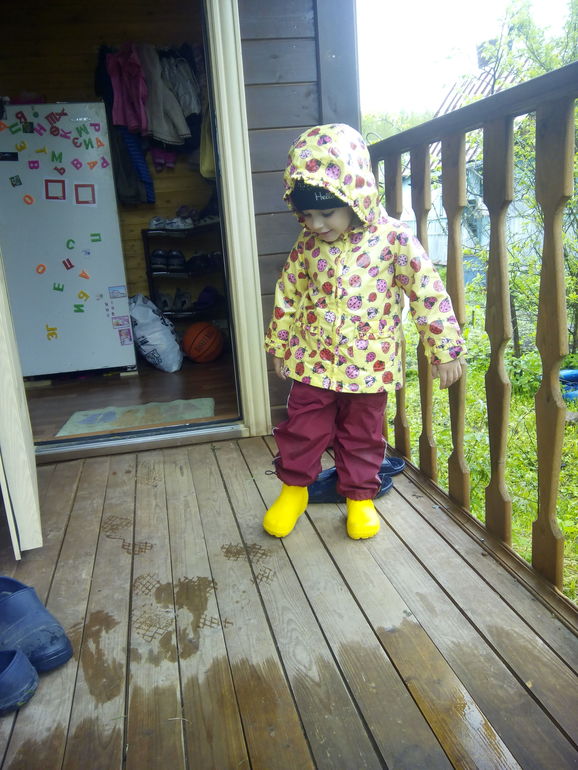 Мы с сыном тоже гуляем в любую погоду, если конечно за окном не ливень. Одеваем дождевик, сапожки и вперёд. Иногда так по лужам набегается, что потом приходиться воду из сапог вливать и сушить несколько дней