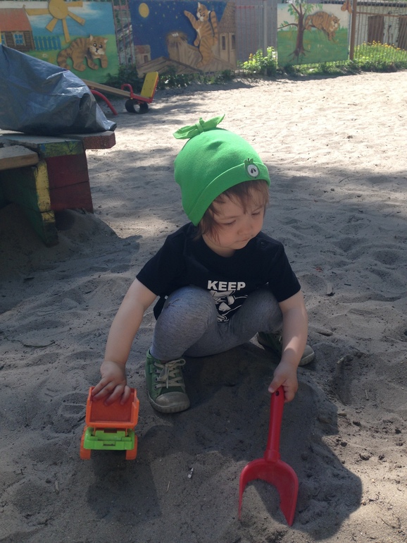 Единственное, что меня напрягает на прогулках, это то что Алиса постоянно несется куда-то и не смотрит ни под ноги, ни вперед, ни на то, что делает, просто несется...и падает, постоянно, она как ванька-встанька, стояла-упала, пошла-завалилась, лезла-плюхнулась...так что на площадке нас видно из далека, порась в зеленой шапке!