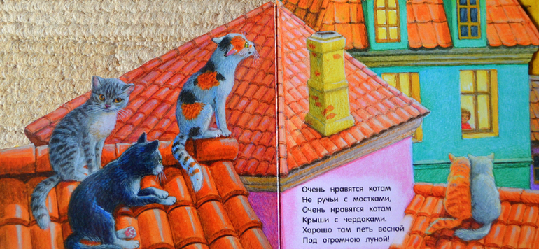 Книга-картонка с яркими иллюстрациями и коротенькими стихами, не обремененными обучающей составляющей. Разве что в поисках котов можно развивать внимание.