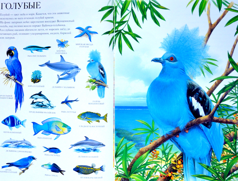 На каждом развороте - множество представителей фауны одного из одинадцати цветов. Рассматривать их - большое удовольствие, т.к. рисунки реалистичны и детальны. Информации по каждому существу - минимум, да и дана она так, как будто из его жизни выбрали один факт. Поэтому, хоть эта книга красива, но она лишь пробуждает интерес к животному миру, не утоляя его.