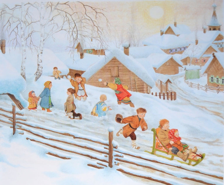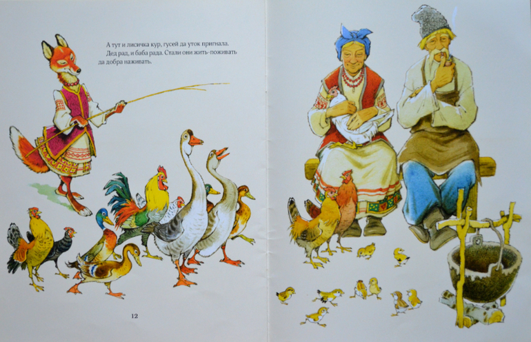 Это издание мне понравилось необычным и очень удачным сочетанием иллюстраций Элен Мюллер и текста. Первые, созданные иностранкой, - детально прорисованные, где-то приукрашивающие деревенскую жизнь, но при этом близкие и приятные, даже нежные. Удивительно то, как гармонично картинки легли на текст Афанасьева!