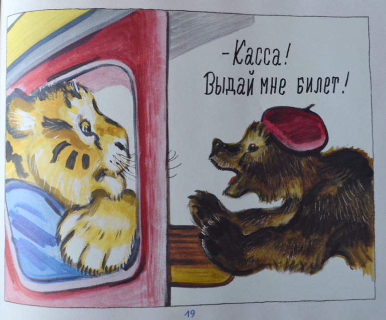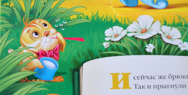 Эту книгу я купила, по-моему, ещё до рождения сына. Тогда я не так ловко ещё умела выбирать книги через Интернет и современные иллюстрации немного огорчили меня. Ведь я помню иллюстрации из своего детства. Кроме того, такие странности, как чистящий зубы цыпленок меня смутили. Но я все перевела в шутку.