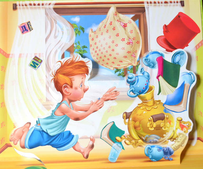 А Диме книга понравилась. Может, потому что красочная. Возможно, потому что это - книга-панорамка. Или, благодаря стихам. Книгу малыш не выпускал из рук дня три и мы читали её подряд раза по четрые-пять...Первый день Диму впечатлял крокодил, гуляющий с "Тото и Коко"))) Второй день - сердитый Мойдодыр - крошка все показывал, как он сердится. И так далее. Каждый раз находилась какая-то интересная деталь.