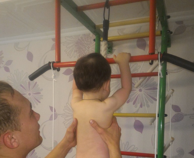 Так умелки: бегаем, носимся, падаем, встаем и снова бежим. Спокойно ходить не умеет, залазиет на диваны, висит на кольцах, на турнике. Спускается по лестнице за руку, аж в припрыжку, перескакивая через три, поднимается, держась за перила. Когда делаю зарядку повторяет за мной, ноги поднимает, на цыпочки встаёт.
