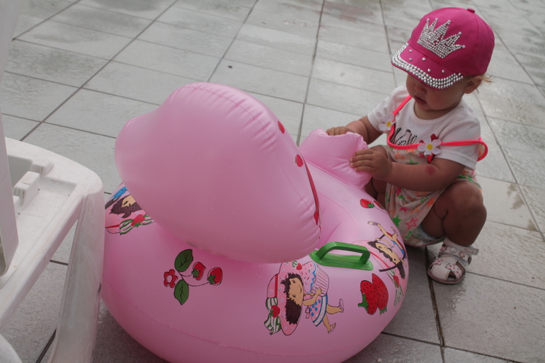 Плавала в своём бассейне,кстати тень он даёт отличную,к нам подходили другие малыши играть,так что обзавелась доча парочкой друзей)