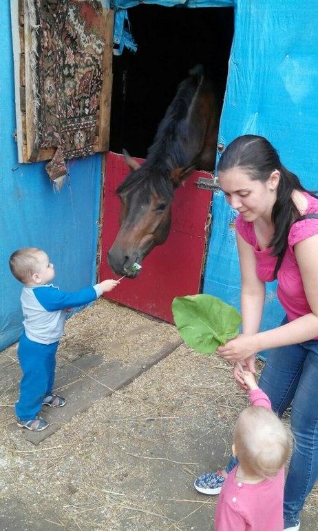 ходим кормить лошадок, недалеко от нас есть конно-спортивный клуб. кормить Айдару нравится, но погладить не решается, боязно)