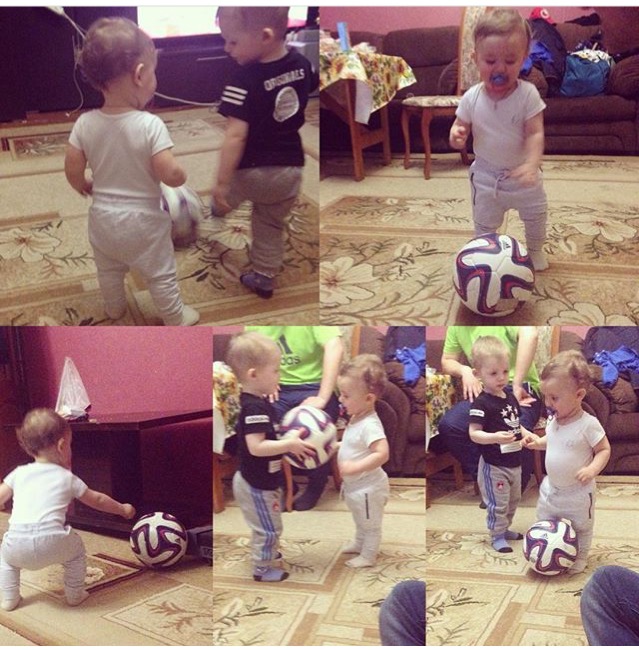 к 10 мес к увлечениям присоединился футбол, как бы я не зарекалась.... Но папа профессиональный футболист роль свою сыграл