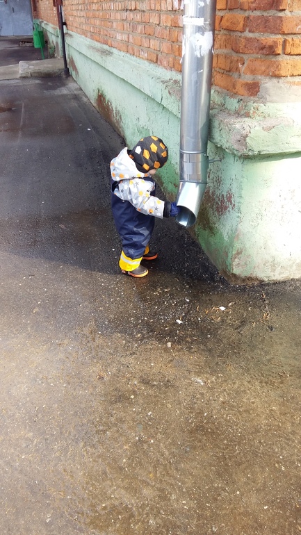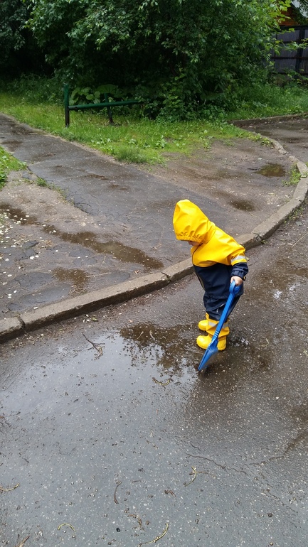 У нас резиновый костюм и сапоги. Можно спокойно полежать в луже, если очень надо. Если тепло-одеваю футболку, шорты и полукомбез. С курткой если в дождь идем или холодно..