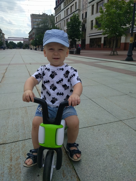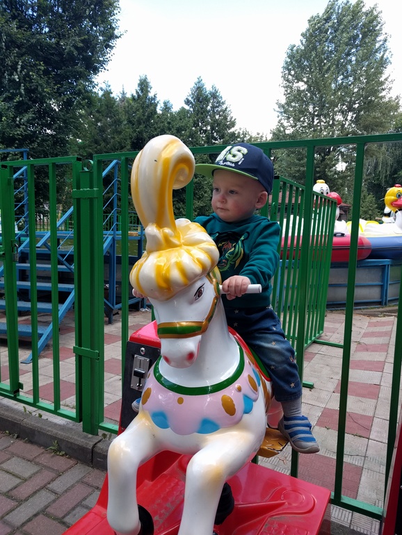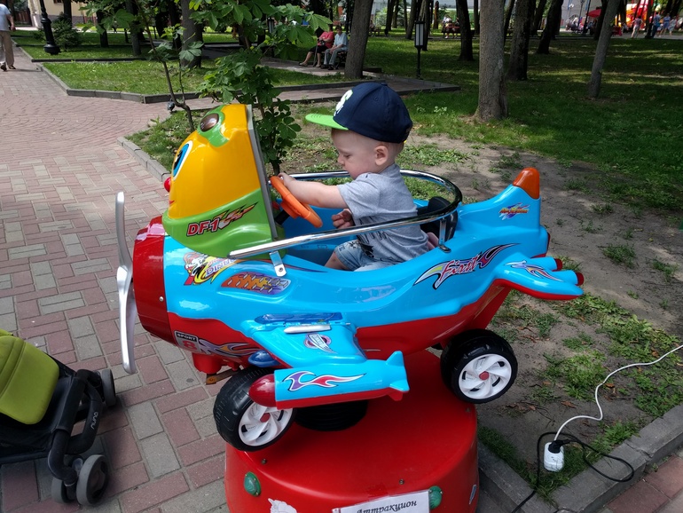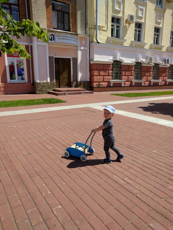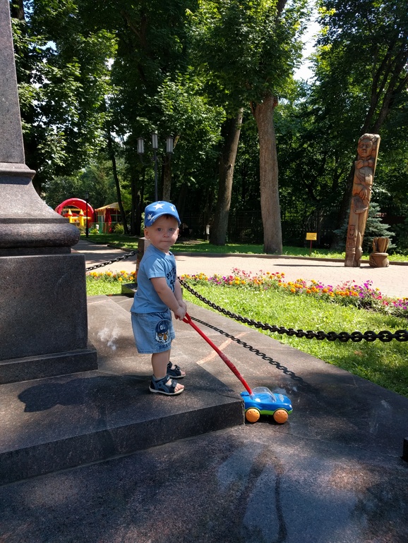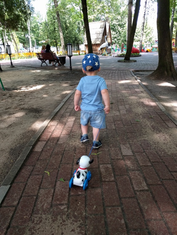 Ванька вообще человек активный. Сидеть в песочнице это не про нас. Про нас - ехать с горки, на беговеле, везти тележку, собаку, улитку, каталку, лезть в трубу, ходить по веревочной лестнице, прыгать по пенькам, гонять кошек, собак, голубей, бежать на аттракционы и вытряхивать из родителей всю мелочь. После 2 часовой прогулки я прихожу без ног, потная, в песке и с улиткой на веревочке в портфеле.