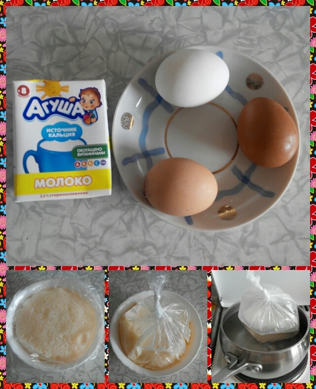 Поставить на огонь среднюю кастрюлю с примерно 1,5 л воды. Яйца взбить венчиком/миксером. Добавить молоко, соль. Перемешать тем же венчиком. Взять неглубокую миску, положить в неё пакет так, чтобы было удобно переливать. Собственно переливаем смесь в пакет, аккуратно завязываем его (можно использовать канцелярские резинки). Помещаем пакет в кипящую воду. Огонь - средний. Варим 10 минут.