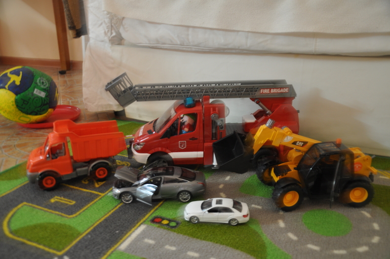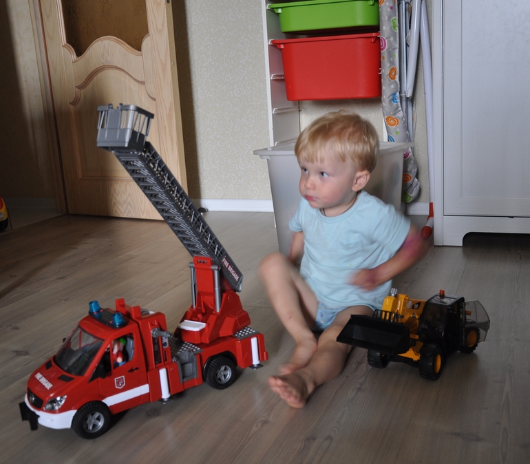 Моя мама, не имеющая возможности поздравить внука лично, прислала денег и я от нее заказала в интернете пожарную машину Мерседес спринт от Bruder. Еще давно я думала подарить ему мусоровоз, так как сын любитель посозерцать процесс забора мусора и его не отташишь пока мусоровоз не уедет восвояси, но почитав отзывы, поняла, что за такие деньги как-то маловато там функционала, даже двери не открываются (а сын любит открывающиеся двери), да и есть уже у нас небольшой мусоровоз и как-то сын в последнее время не часто в него играет. Он вообще не вот прям фанат машин, не спит с ними, не кормит, не поит как тут наши друзья на ББ, но от пожарной машины пришел в неописуемый восторг и вот уже третий день подряд играет с ней достаточно долго. Фотки, специально для бабушки, как доказательство какой прекрасный подарок она подарила :)))