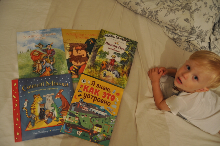 От себя я подарила "Сонного мишку" Иана Уайброу с иллюстрациями горячо мной любимого Шеффлера. Да, я знала, что за 500 рублей книжка на 6 разворотов как-то дорого ( в Лабиринте она вообще 800 стоит, ни за что бы не купила за такие деньги), мало текста, один стишок всего, да там криво перевели некоторых зверей - так нарисованный скунс вдруг стал бурундочком, а вомбат - медведем. Но интуиция мне подсказывала, что сын все равно будет в восторге от всех этих окошек, двигающихся элементов и я не прогадала, мы читаем ее перед сном по 3-4 раза, наверное он бы и 5 раз послушал, но я уже сама не могу это читать :) Рекомендую, если сможете закрыть глаза на вышеперечисленные недостатки и закажите ее на СП :)