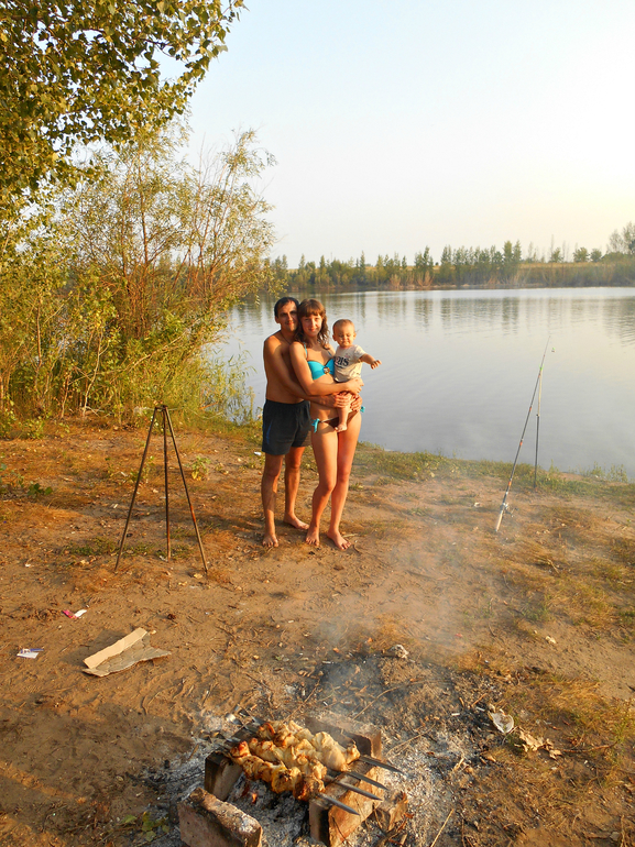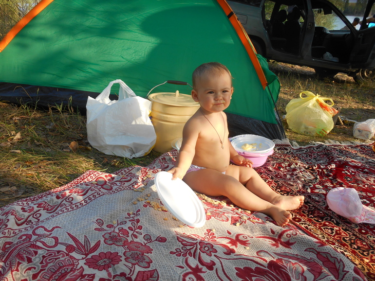 Путешествия с малышомПривет девченки. Ездили снова отдыхать с палатками на Гагаринский пруд, приехали утром, уехали на следующий день вечером. Доча как всегда вела себя хорошо, было конечно чуточку капризов, но это не страшно. Вода теплая, доча накупалась, небегалась по песочку, и конечно свежий воздух это отлично. Раньше думала что куда то выехать с ребёнком просто будет тяжело, но все отлично, и я рада что мы ее всегда берем с собой( ну и конечно весь ее гардероб, пеленки, фрукты, каши). И еще ей очень понравилась уха на костре. И безумно ей понравилась рыбка, которую я поймала.