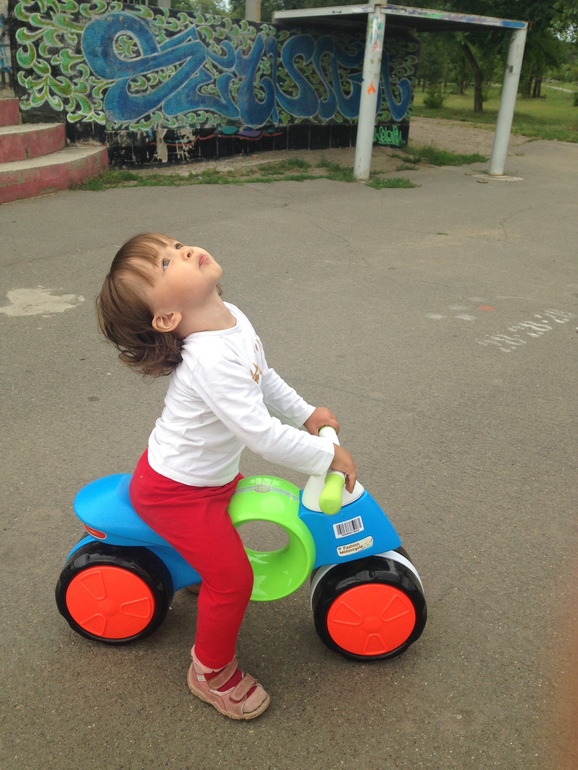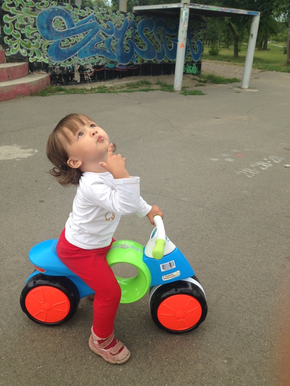 на свои 18 Алиса получила каталку-мотоцикл, это такой пробный этап для беговела, трехколесный я брать не хотела, так как понимала, что потом понадобится обновить его до 2-колесного, а лета осталось не так много,и получится, что 3-колесный только на месяц, два. Короче…я решила сэкономить и взять зимой клевый 2-колесный беговел со скидкой на следующие весну-лето, а пока подогреть интерес с помощью каталки. От которой Алиса, кстати, в восторге, научилась крутить руль, только надо кричать "рули", когда видишь, что барышня несется на своем мотоцикле в кусты, она резко начинает крутить руль и как-то выворачивает на дорогу.