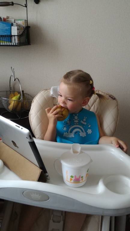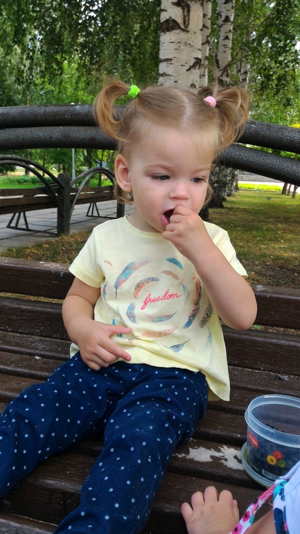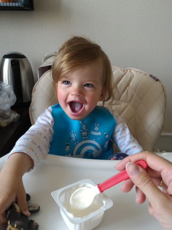 Теперь ложга дегтя. Настя почти не кушает ложкой. Она умеет это делать, и кушает, если еда ей очень нравится (например, творожную запеканку). Но в 90% случаев Настя требует кормить ее. То же самое с питьем из чашки. Максимум, чего мы добились, это питье из трубочки и из бутылки с узким горлышком. Но в основном, пьет из бутылки с соской сильно разбавленный компот. С горшком такая же беда. Не хочет на него садиться и хоть убейся. Но с горшком я не заморачиваюсь особо. А вот с питьем из бутылки уже начала напрягаться. Все еще часто сосем соску, но из-за адаптации к саду, соску пока не убираю.
