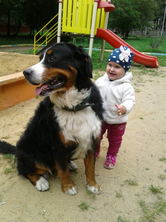 Доченька у нас очень-приочень шустрая! Наша страсть - собаки! Я боюсь этого, так как обьяснять ей, что нельзя бежать к собакам может быть опасно. По фигу....бежит визжит от счастья! Вот последняя любовь, которую встретили на прогулке: